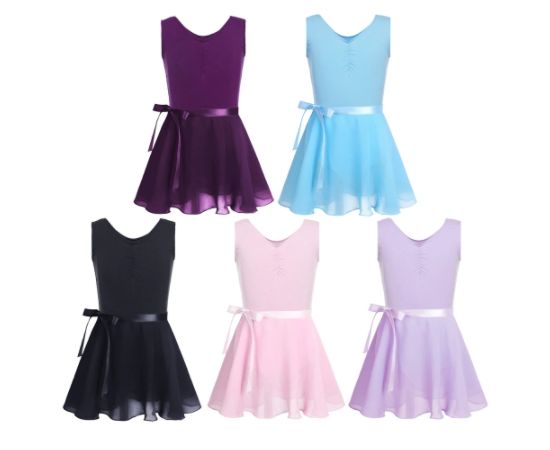 Эта коллекция гимнастических купальников с юбочками представлена несколькими цветами и размерами.