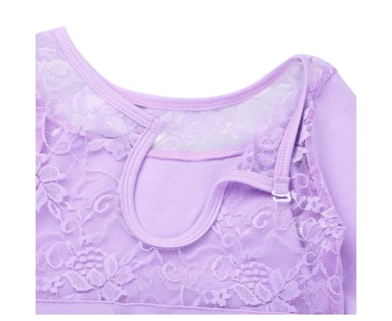 Спереди и на спинке гимнастического купальника для девочки выполнены кокетки из нежного кружева (не колется!), на спинке под застежкой - вырез в форме капельки.