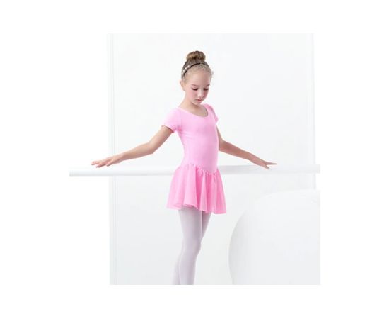 Платье для танцев с коротким рукавом для девочки выполнено на основе гимнастического купальника с удобной застежкой трусиков на кнопки. Пришитая юбочка выполнена из плотного шифона. Спинка украшена круглым вырезом с красивым бантом. Хлопок с добавлением спандекса обеспечивает комфорт ткани для тела, позволяет коже ребенка дышать, при этом хорошо тянется что удобно для активных движений на занятиях танцами. Короткий рукав этой одежды для бальных танцев прикрывает плечики.