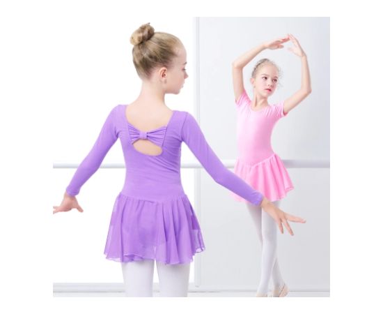 Платье для танцев с коротким рукавом для девочки выполнено на основе гимнастического купальника с удобной застежкой трусиков на кнопки. Пришитая юбочка выполнена из плотного шифона. Спинка украшена круглым вырезом с красивым бантом. Хлопок с добавлением спандекса обеспечивает комфорт ткани для тела, позволяет коже ребенка дышать, при этом хорошо тянется что удобно для активных движений на занятиях танцами. Короткий рукав этой одежды для бальных танцев прикрывает плечики.
