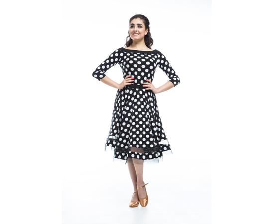 Топ/блуза для танцев из мягкого стрейч-трикотажа с женственным декольте отлично походит для тренировки и выступления. Рукав чуть ниже локтя. Игривый горох создает настроение и разнообразит ваш танцевальный гардероб.